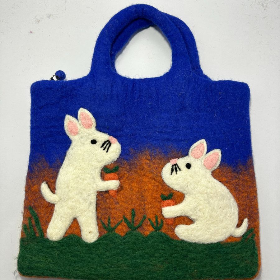 Felt bag in blue color with two sweet white bunnies carrying a carrot. It’s made from elegant eco-friendly felt safe for kids. It’s perfect for daily use, for gifting or as accessory for kids who is bunny admirer. It’s durable plus lightweight can hold your snacks, wallet, stationary, kid toys, mobile phone etc.